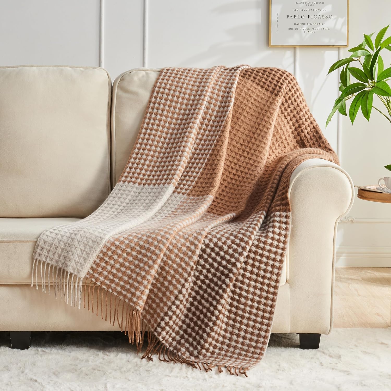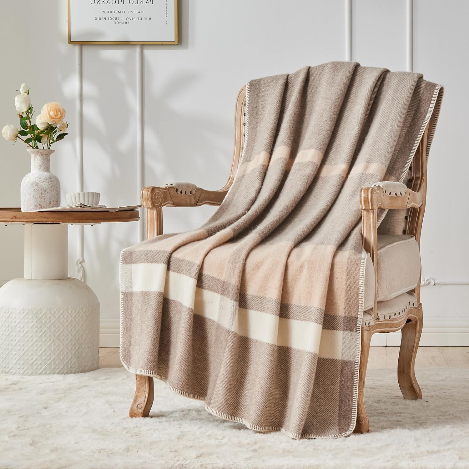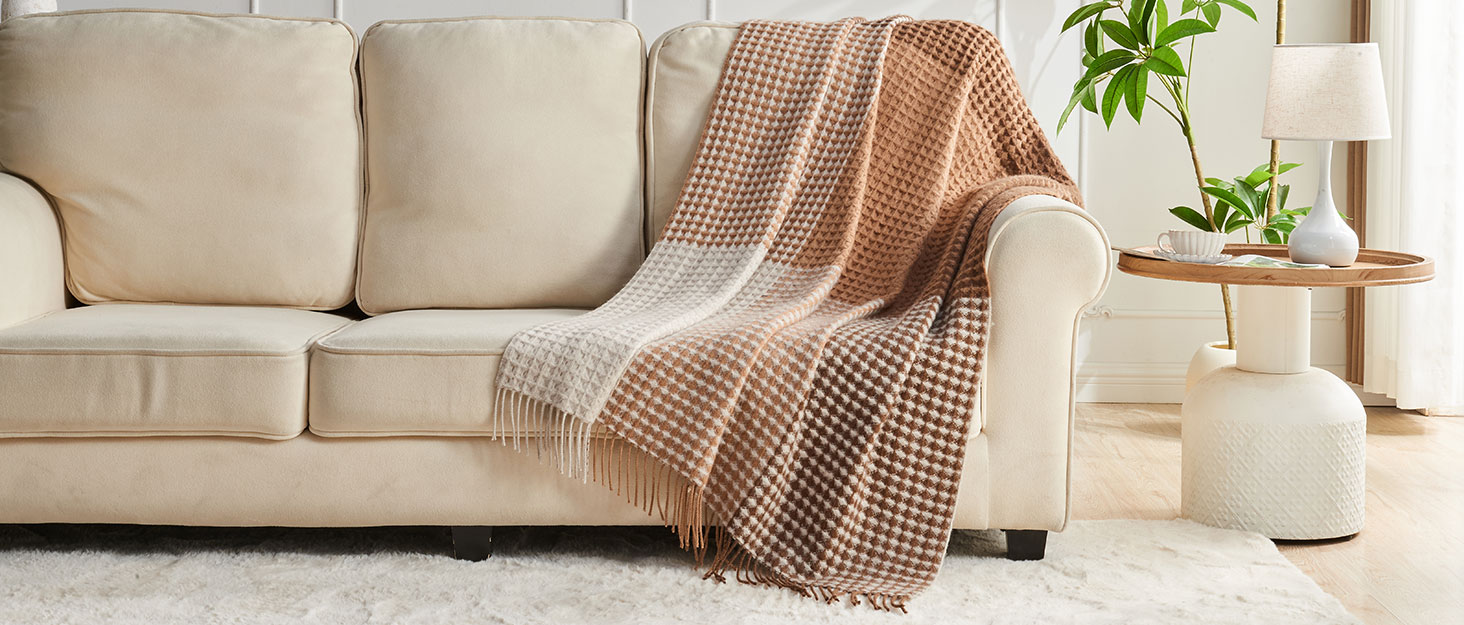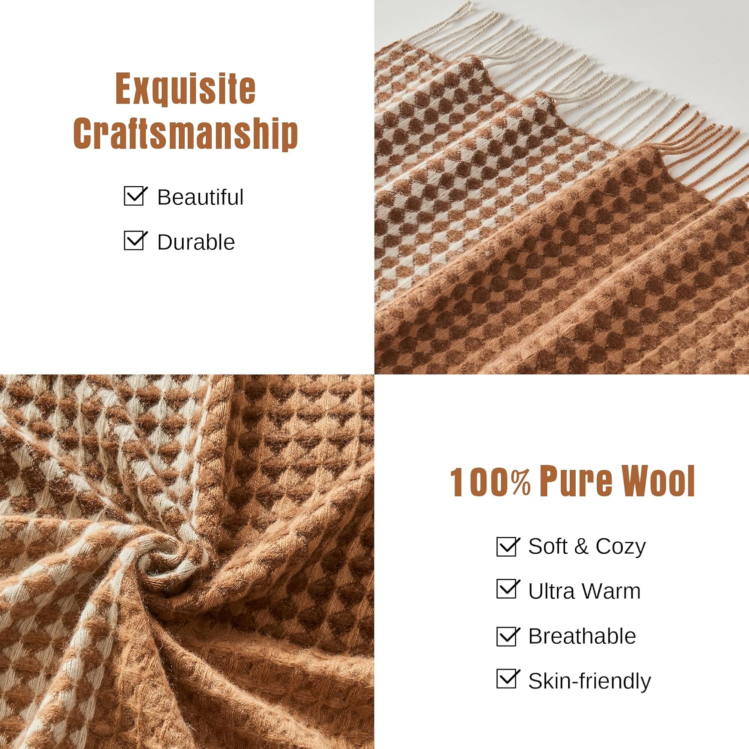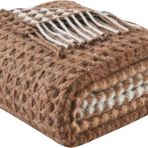 100% Wool Throw Blanket Checkered 75×46 in Camel White Varicolored i##e##s: Luxuriously Warm ^^ Soft ^^ Cozy ^^ Reversible ^^ Breathable ^^ Modern ^^ for Sofa Bed ^^ Home Lounging ^^ Travel Gift ^^ Decorative :i##e##s