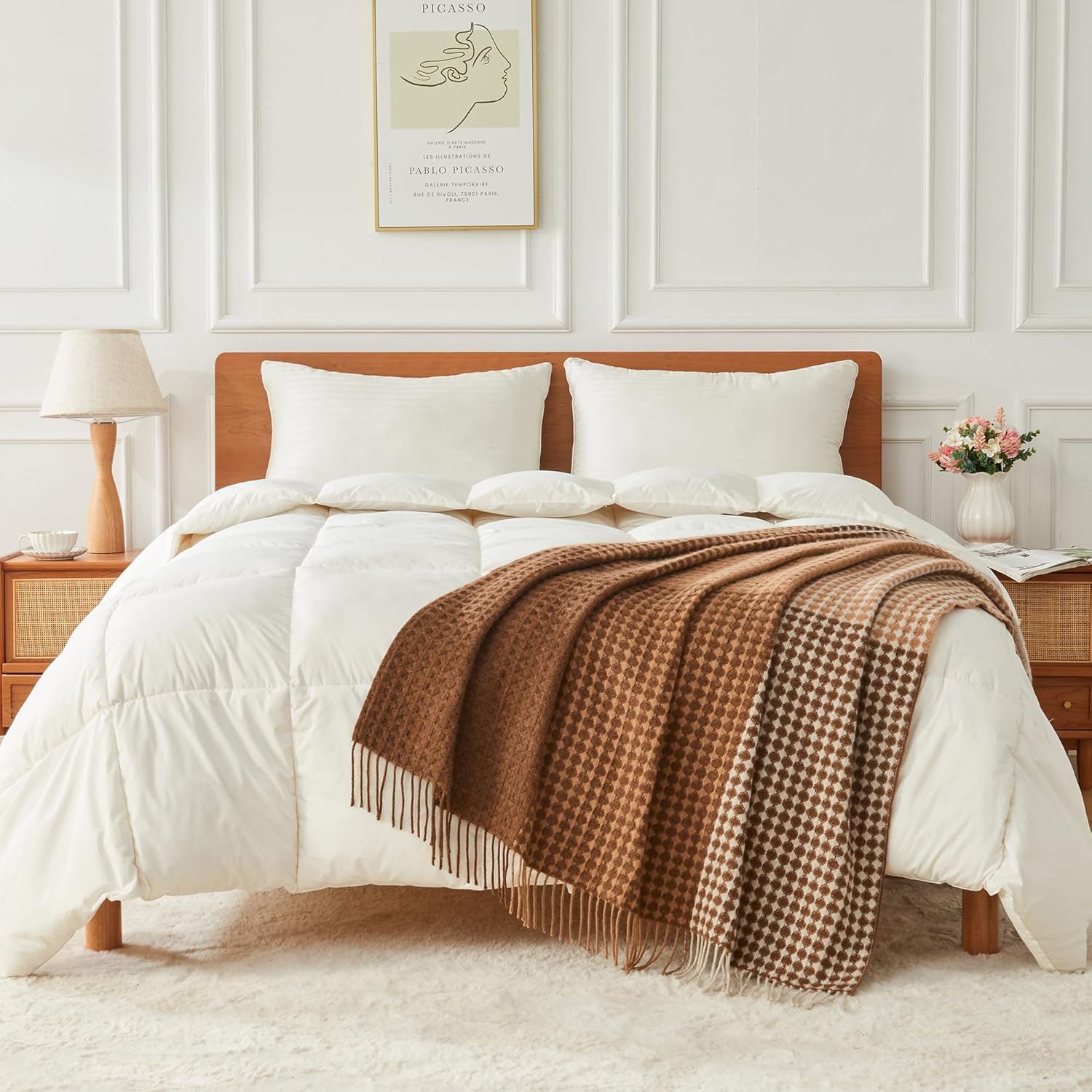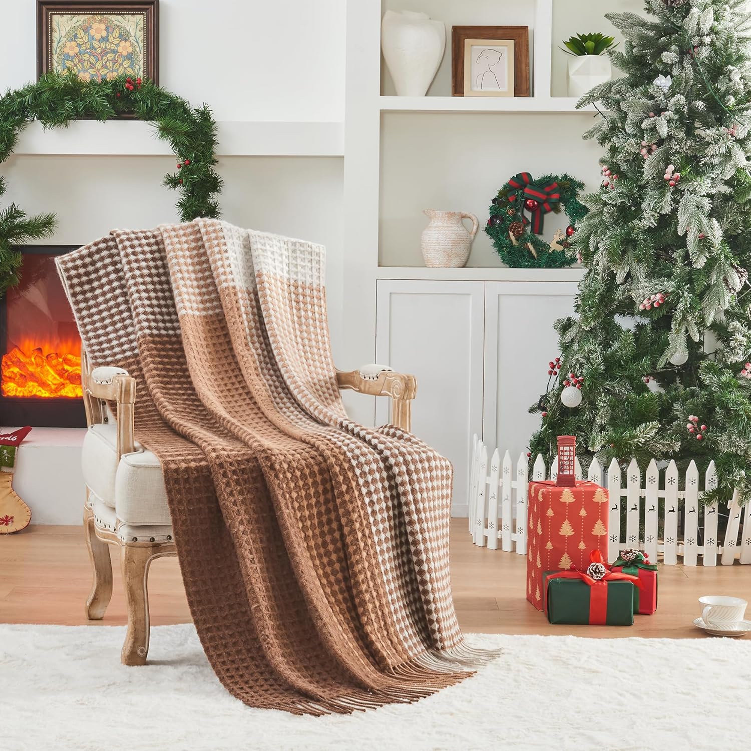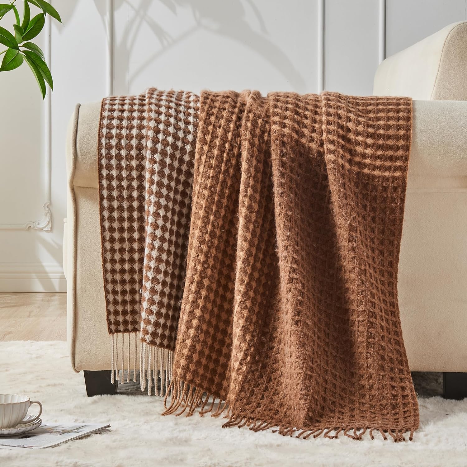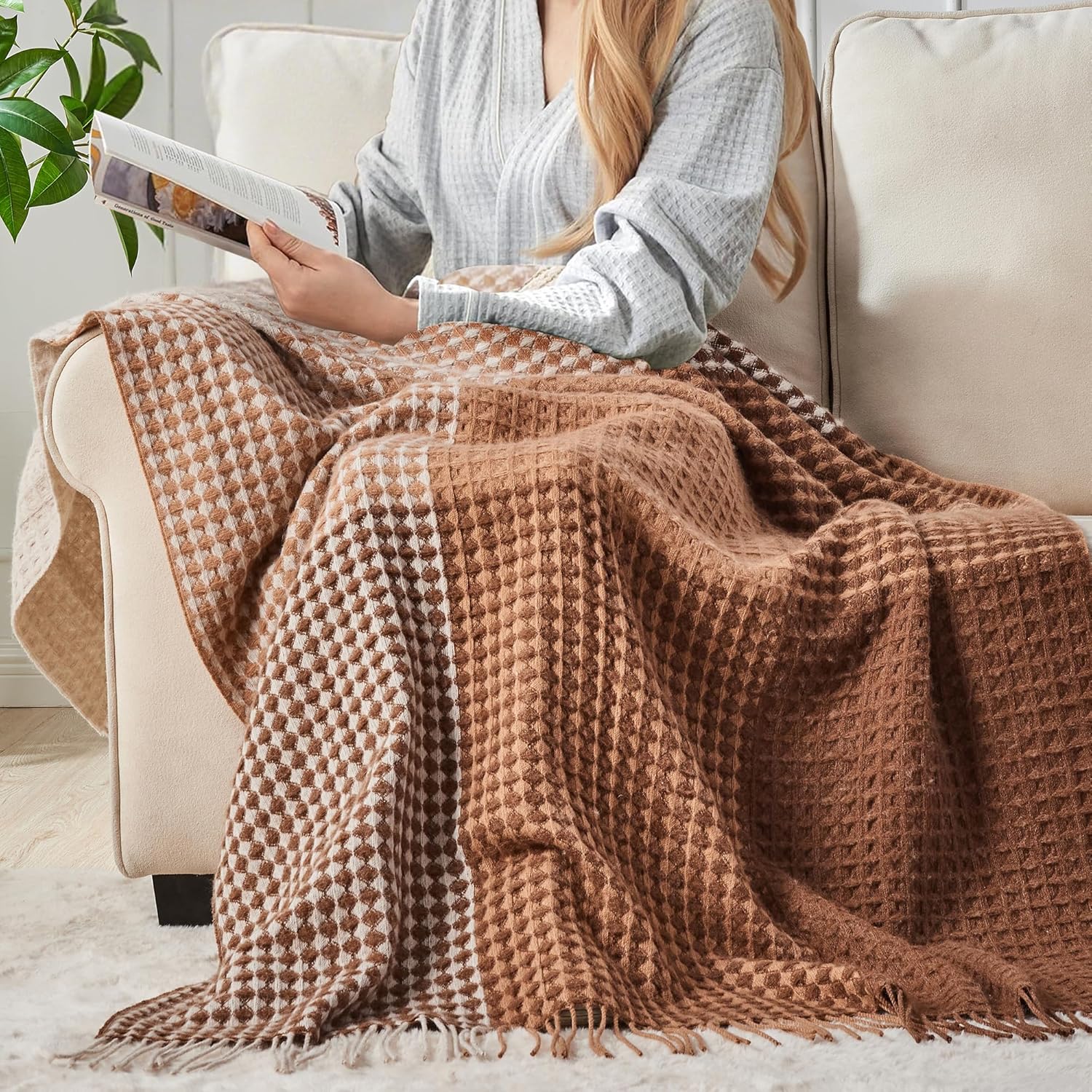 100% Wool Throw Blanket Checkered 75×46 in Camel White Varicolored i##e##s: Luxuriously Warm ^^ Soft ^^ Cozy ^^ Reversible ^^ Breathable ^^ Modern ^^ for Sofa Bed ^^ Home Lounging ^^ Travel Gift ^^ Decorative :i##e##s