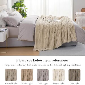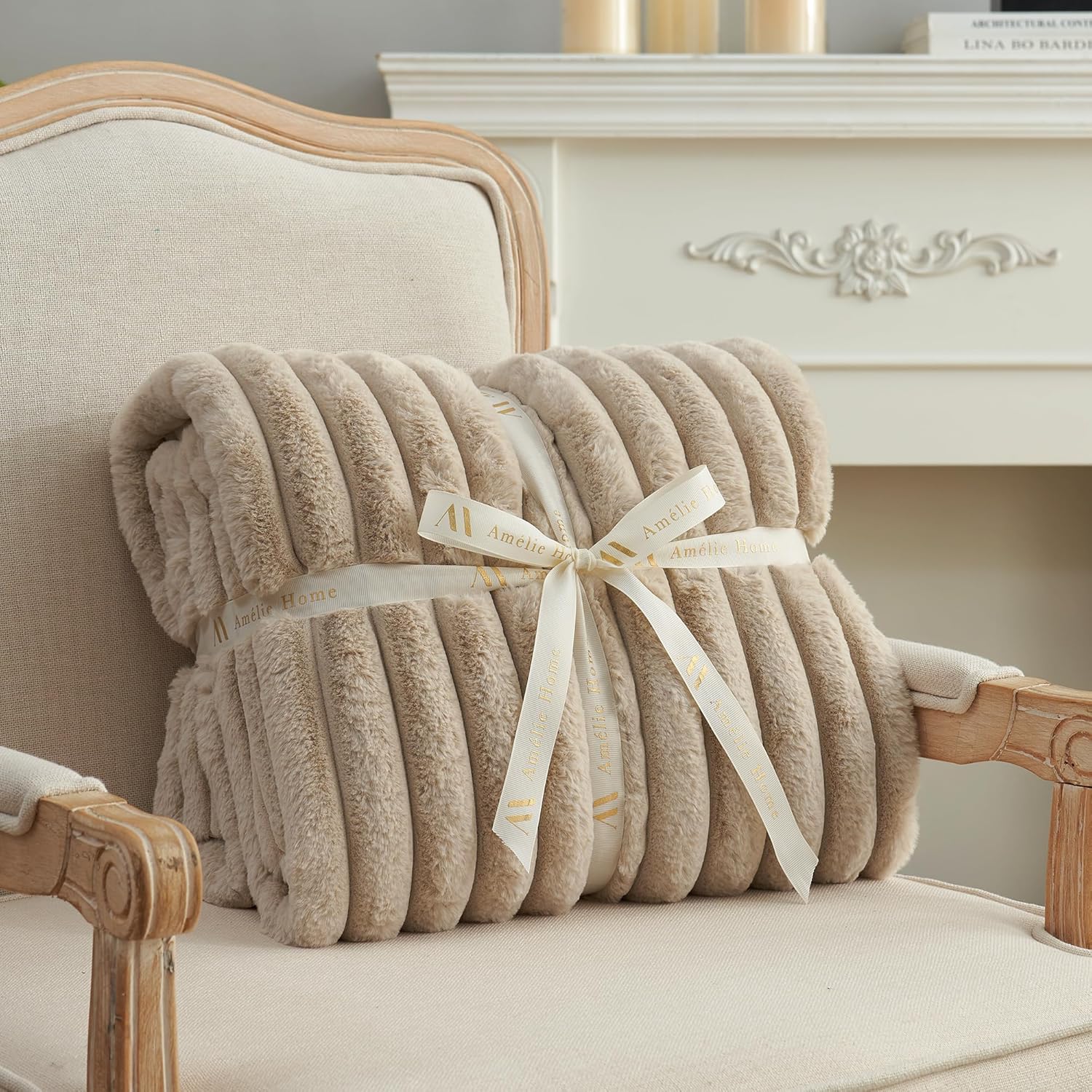 Amélie Home Faux Fur Throw Blanket for Couch, Cozy Fuzzy Fluffy Fur Luxurious Soft Striped Plush Gift Blankets for Family Sofa Chair Bed Living Room Bedroom, 55″x70″, Beige