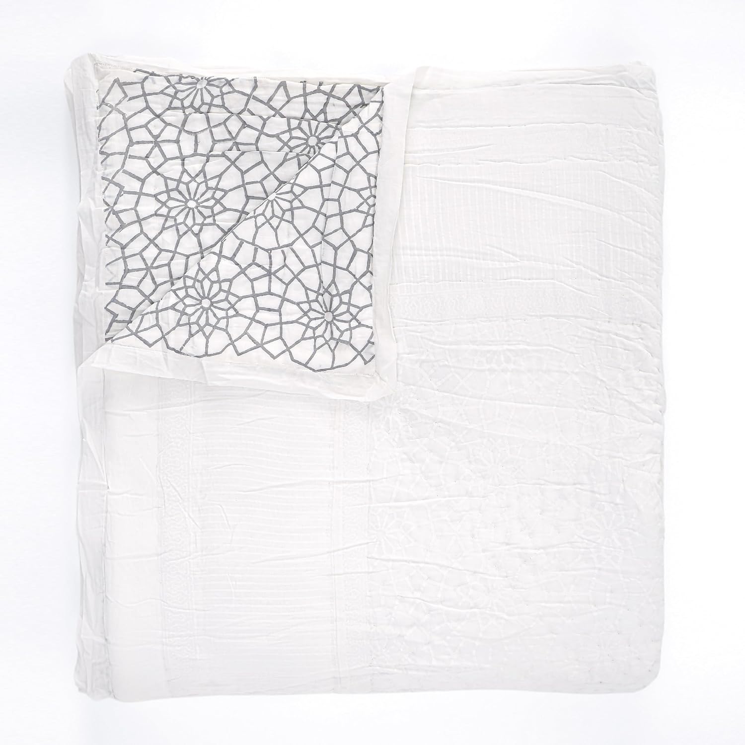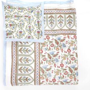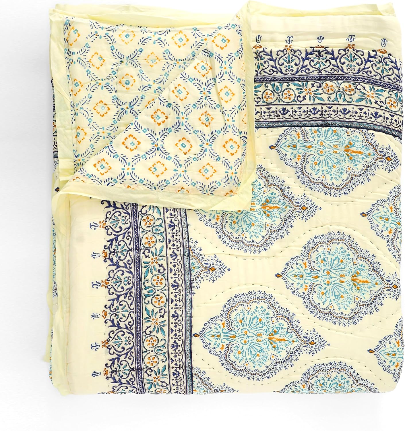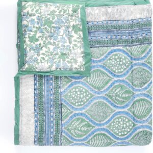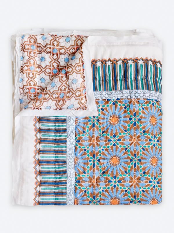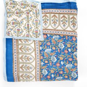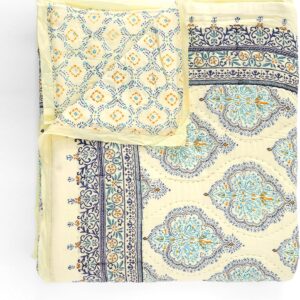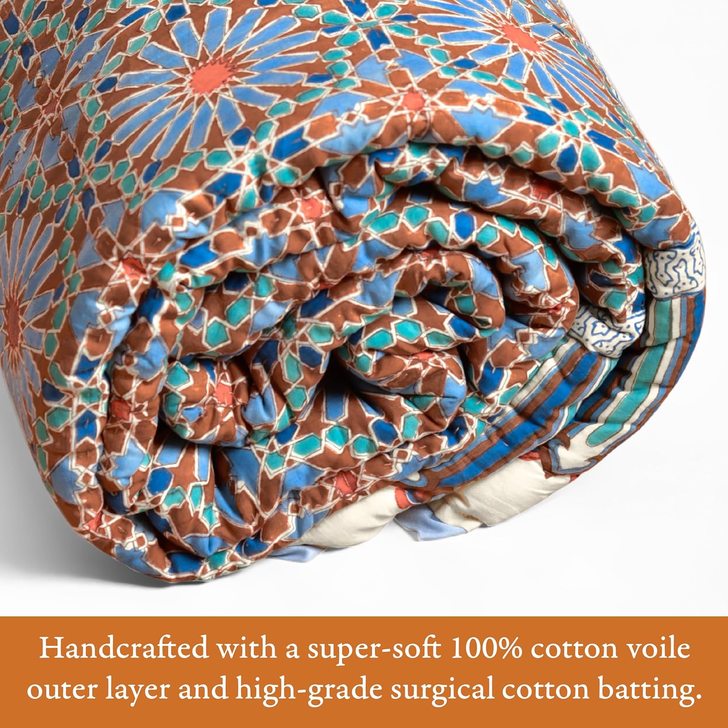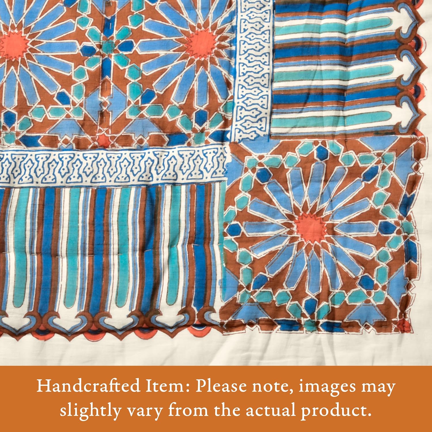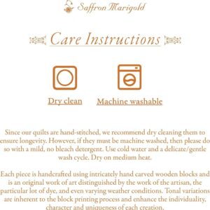 The artisan stamps the wooden block onto the fabric, transferring the design with precision and care. This is done repeatedly across the fabric's surface, as the artisan works from border to outline to main print and finishing touches.
